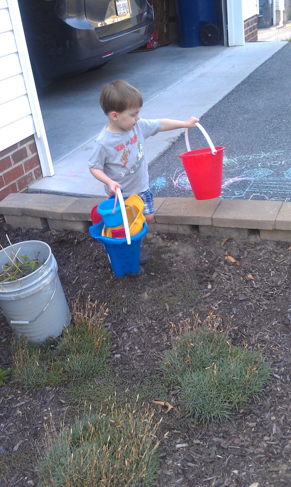 The weather over the past several weeks has been wicked hot. The kids can only stay cooped up in the house for so long. The other night we decide to go outside after dinner and invade the cooler weather (in the 80s still). One of the items on the to do list was weed the gardens. Any time Derek can use his shovels and pails he has a blast. Brooke is determined not to be to far behind her big brother and enjoys playing in the dirt almost as much has Derek does. Needless to say Megan and I weeded the gardens while Derek and Brooke released some energy before bedtime.
